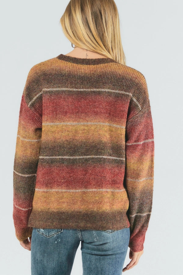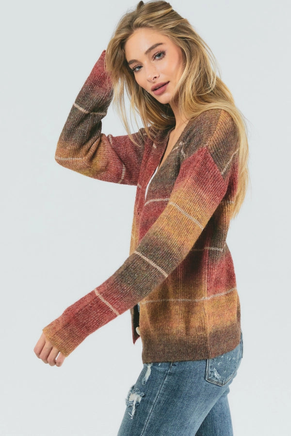 This beautiful cardigan is the essential layer to add a little warmth to your fit. The gradient pattern is beautiful, and the gold accents elevate this even more!