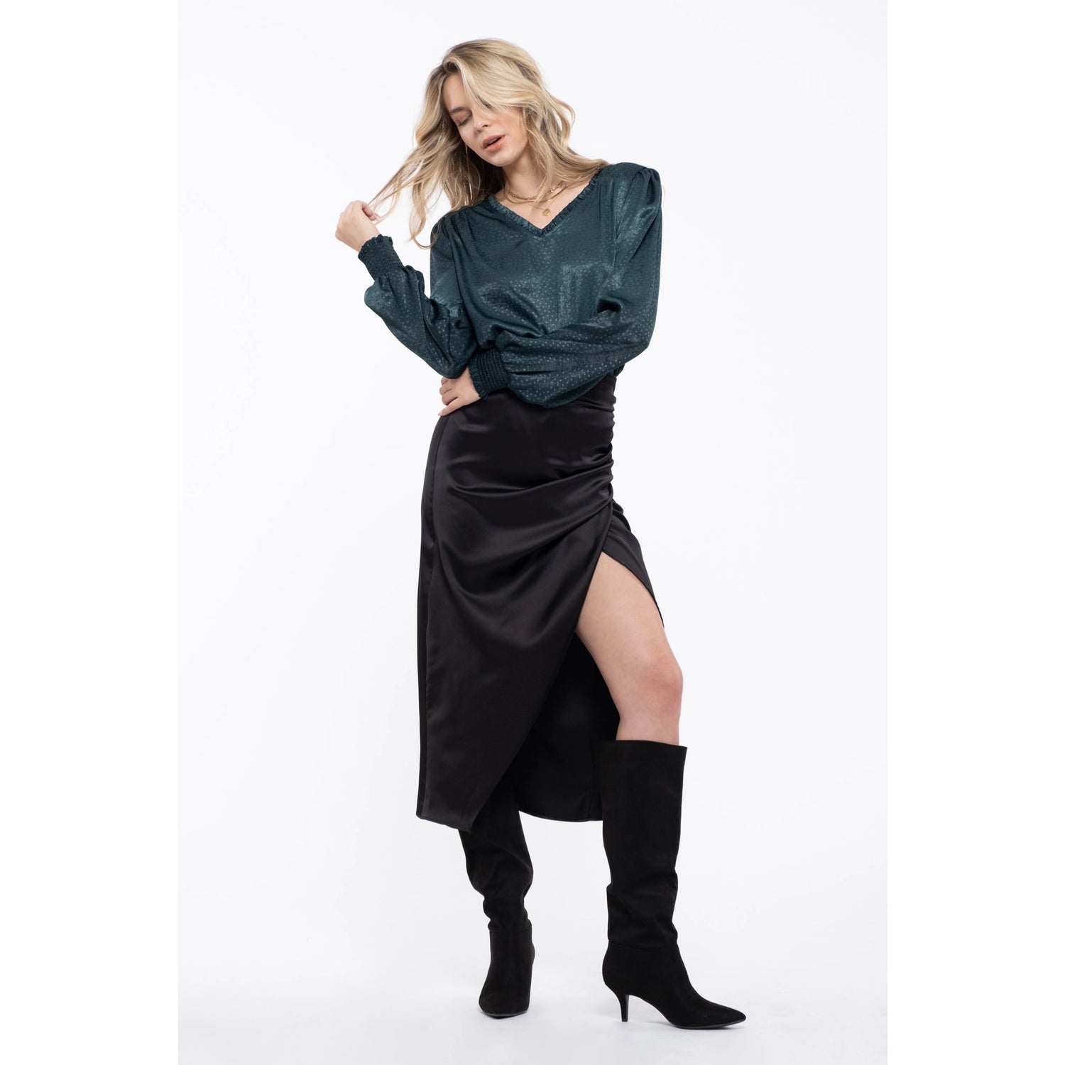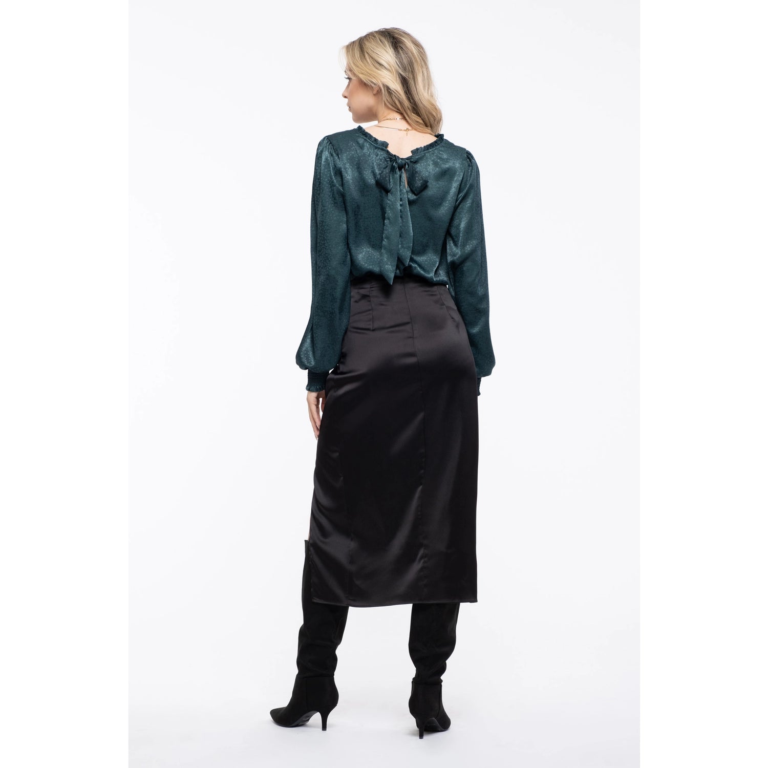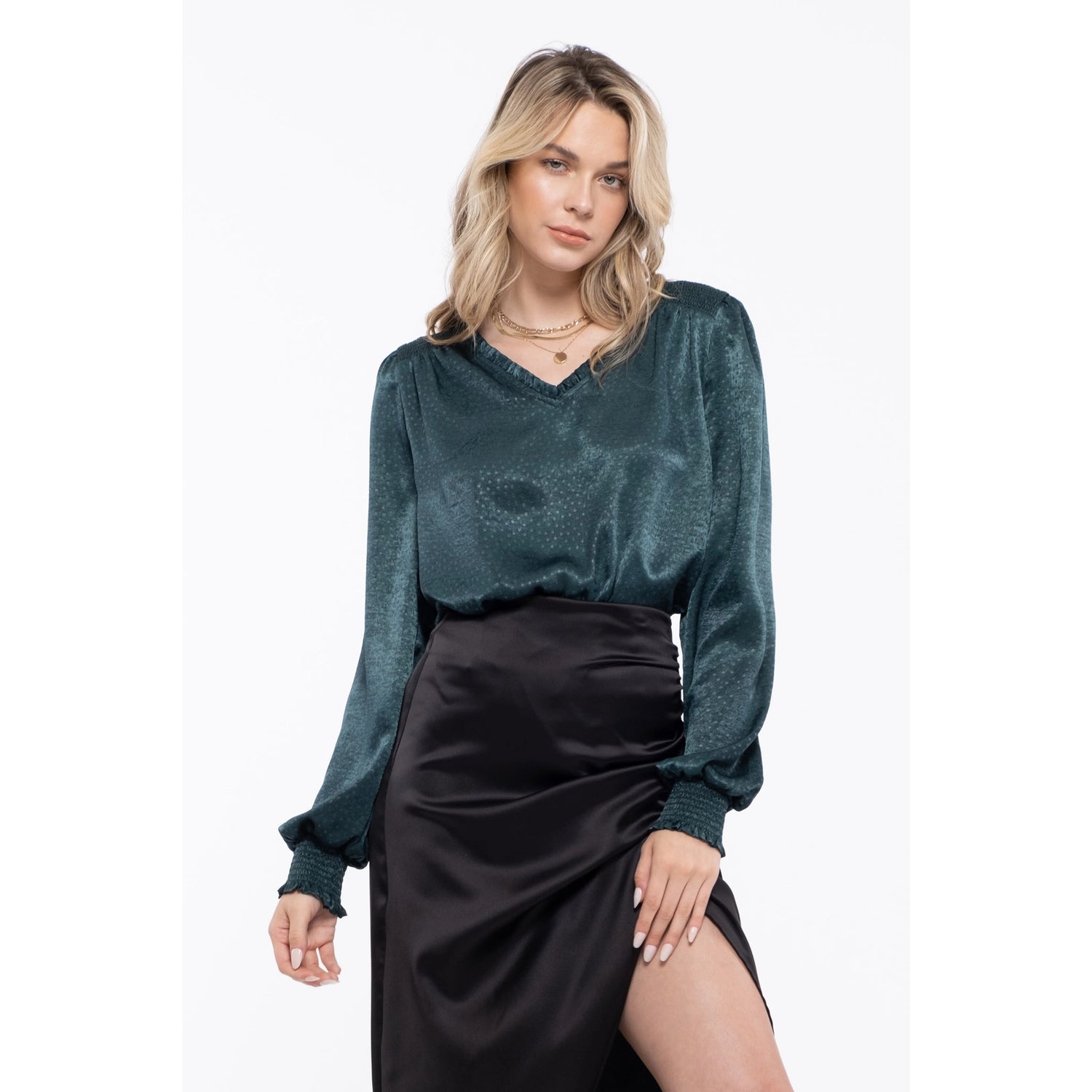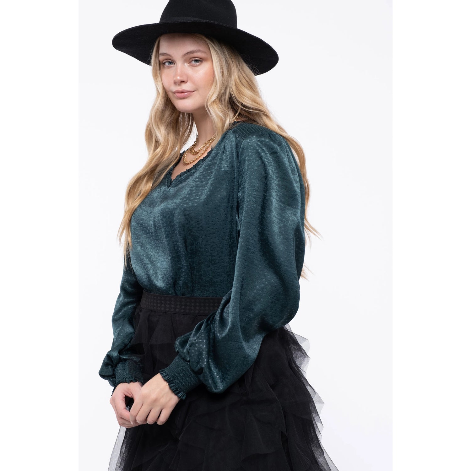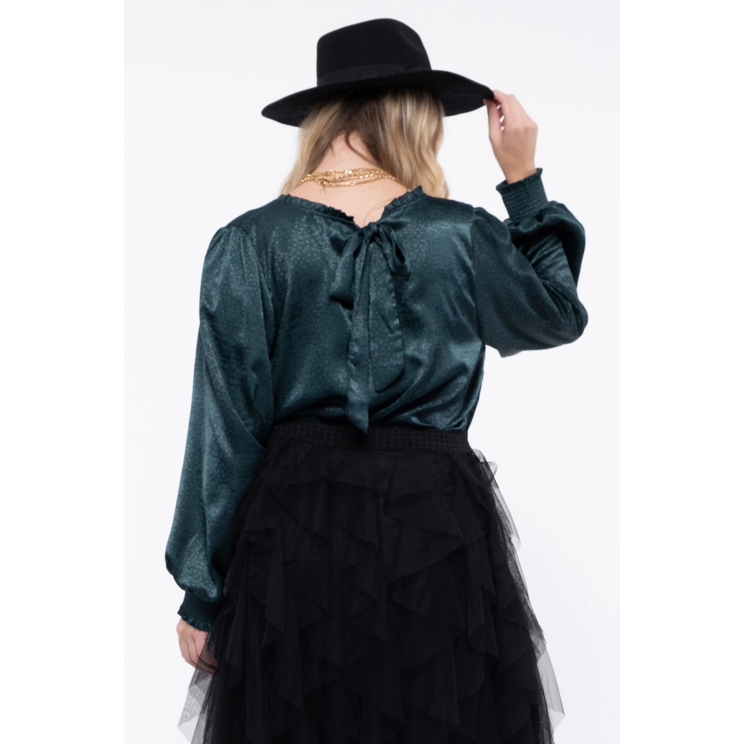 This top is so dressy and gorgeous, but not overly fussy. The gorgeous dot pattern, delicate ruffle detail and back tie is enough to elevate your look, whether you're wearing jeans or a tailored skirt.