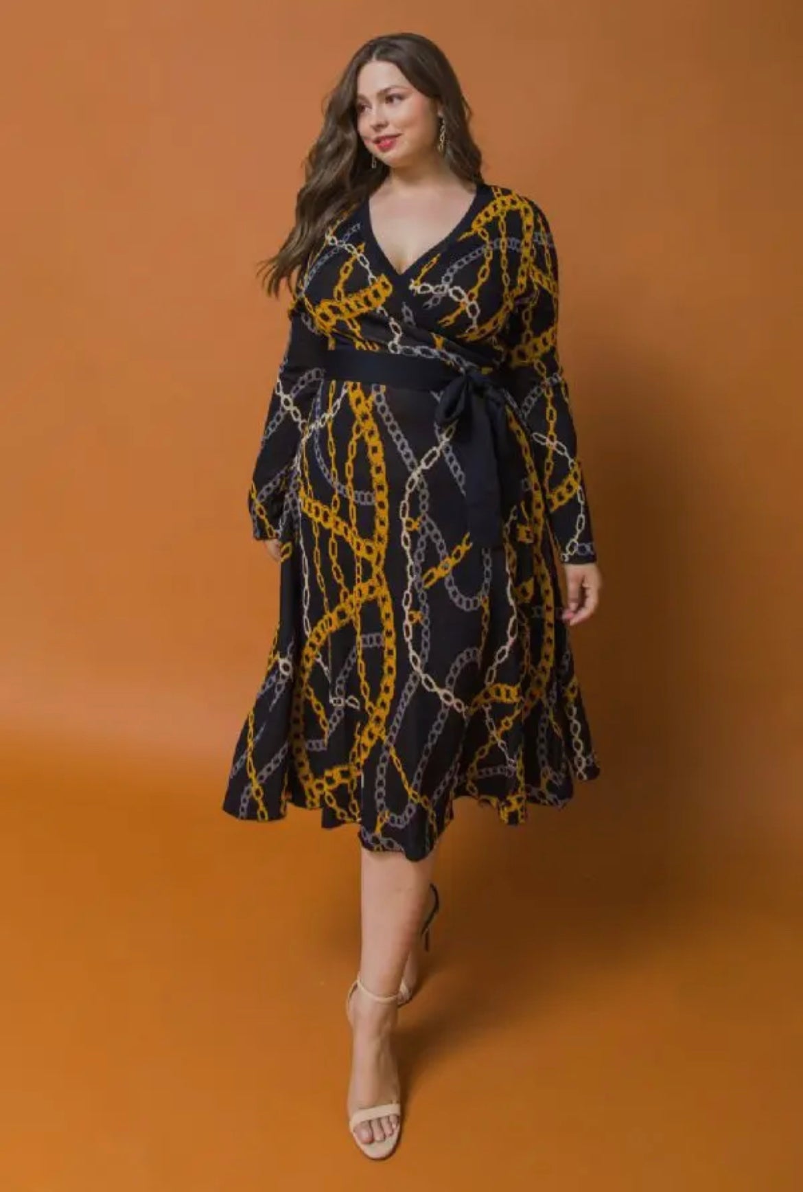 Holy smoke show! Get ready to turn heads in this stunning sweater dress. It’s lux and unique and so ready to party. The surplice top, belted waist, and fit and flare shape are universally flattering on everyone, and the chain pattern is sophisticated and classy. There’s a hint of sparkle in the black background to catch the light, just like you do!