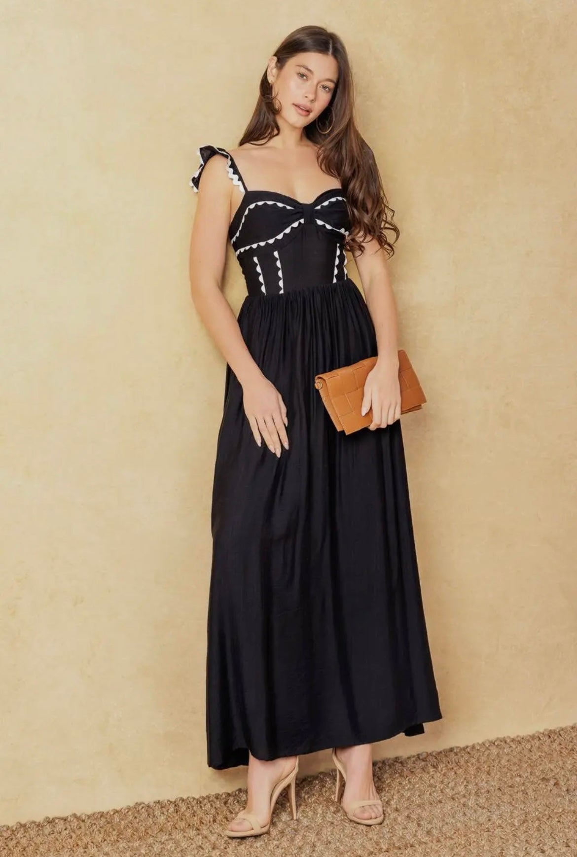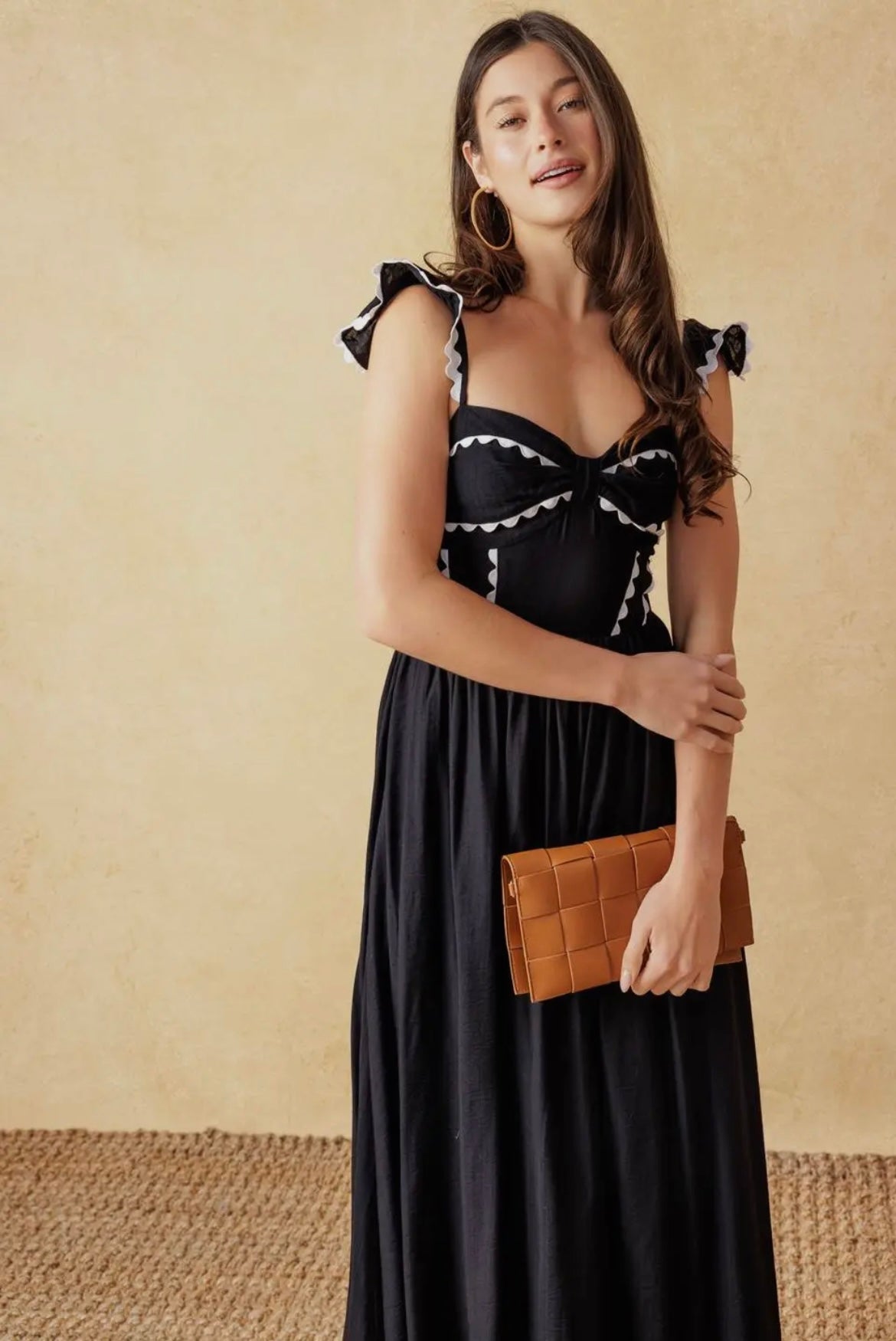Turn heads in this gorgeous dress that’s good for events all year long. Featuring beautiful details like ric rac trim, feminine bow detailing at the bust, and pockets.