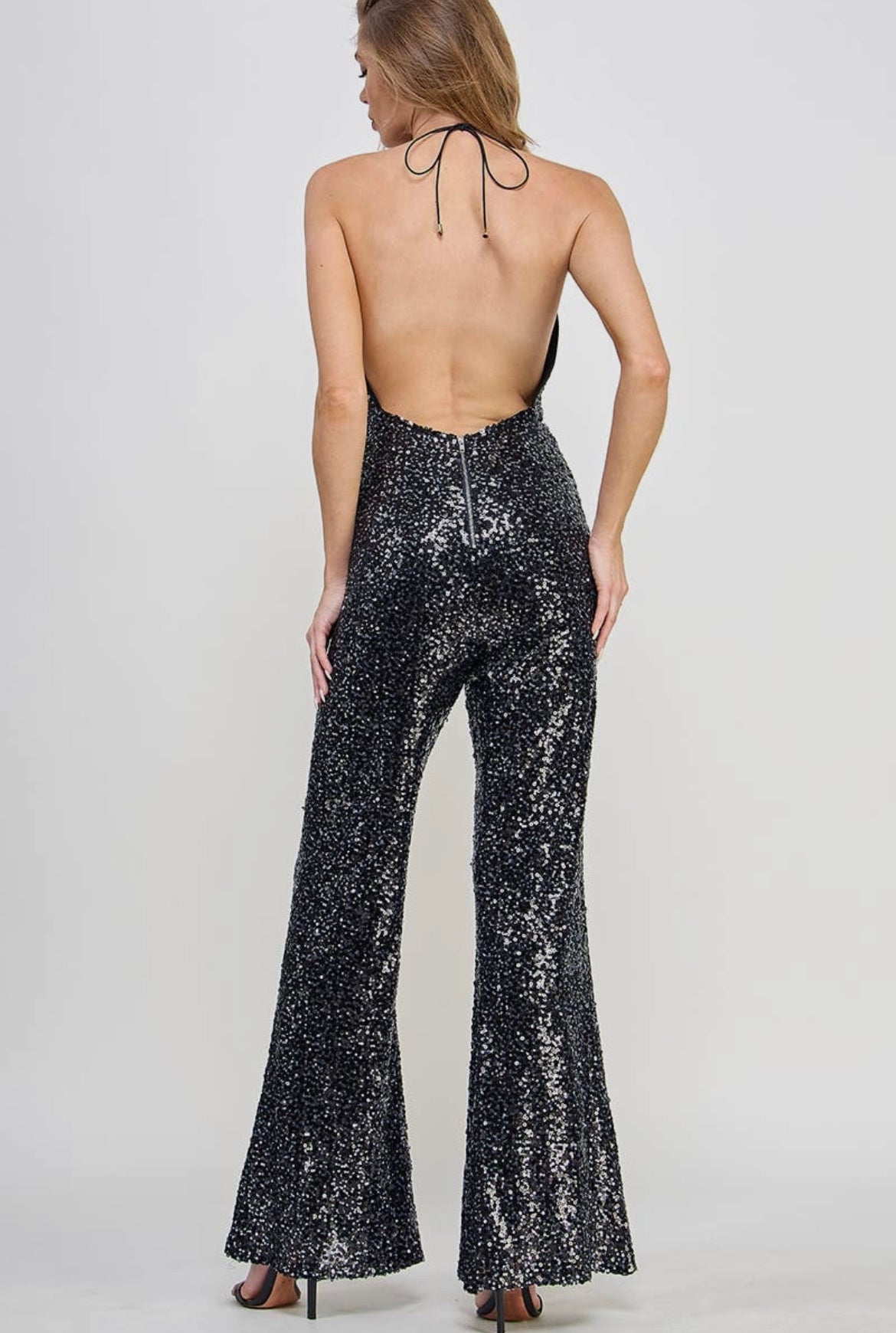 The perfect party jumpsuit DOES exist. This gorgeous, glitzy outfit will have you ready for whatever the party throws at you. The deep cowl neckline is completely adjustable with a tie back, which allows you to control how much skin you want to show and for your height. At 5’11, I can extend this so it’s just long enough, but it can be adjusted to fit a variety of heights and shapes! The lining is so smooth and buttery with no scratchiness and just the right amount of stretch. Open back.