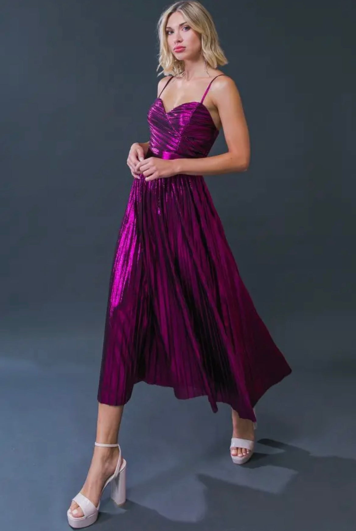 Sparkle and shine your way through all of your upcoming events in this gorgeous pleated midi dress. It’s perfectly swingy, classy, and fun.