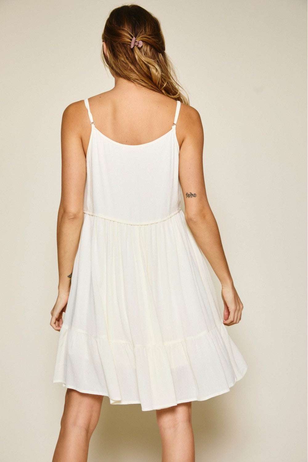 This is your new favorite sundress! The crepey texture, lace and eyelete details, and swingy shape is the stuff dreams are made of. The color is just a tad more pale yellow than the picture portrays.