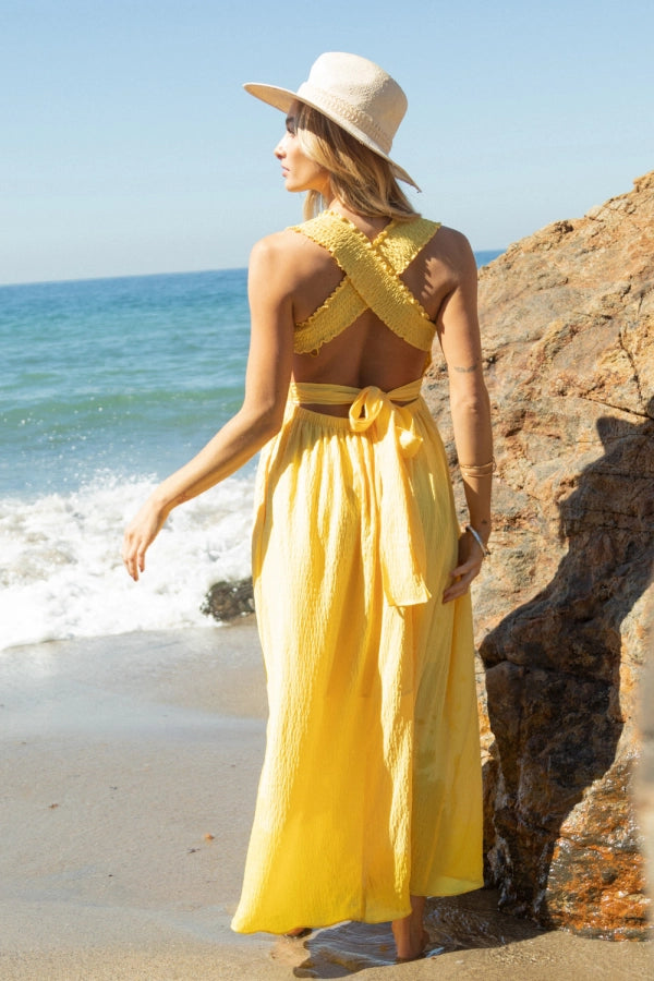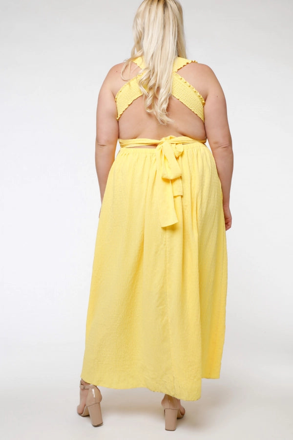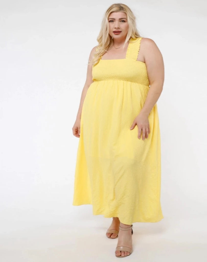 Outfits just don't come any sunnier than this. The smocked top and back tie provide extra comfort and a custom fit for this adorable maxi dress. Available is sizes S-3X.