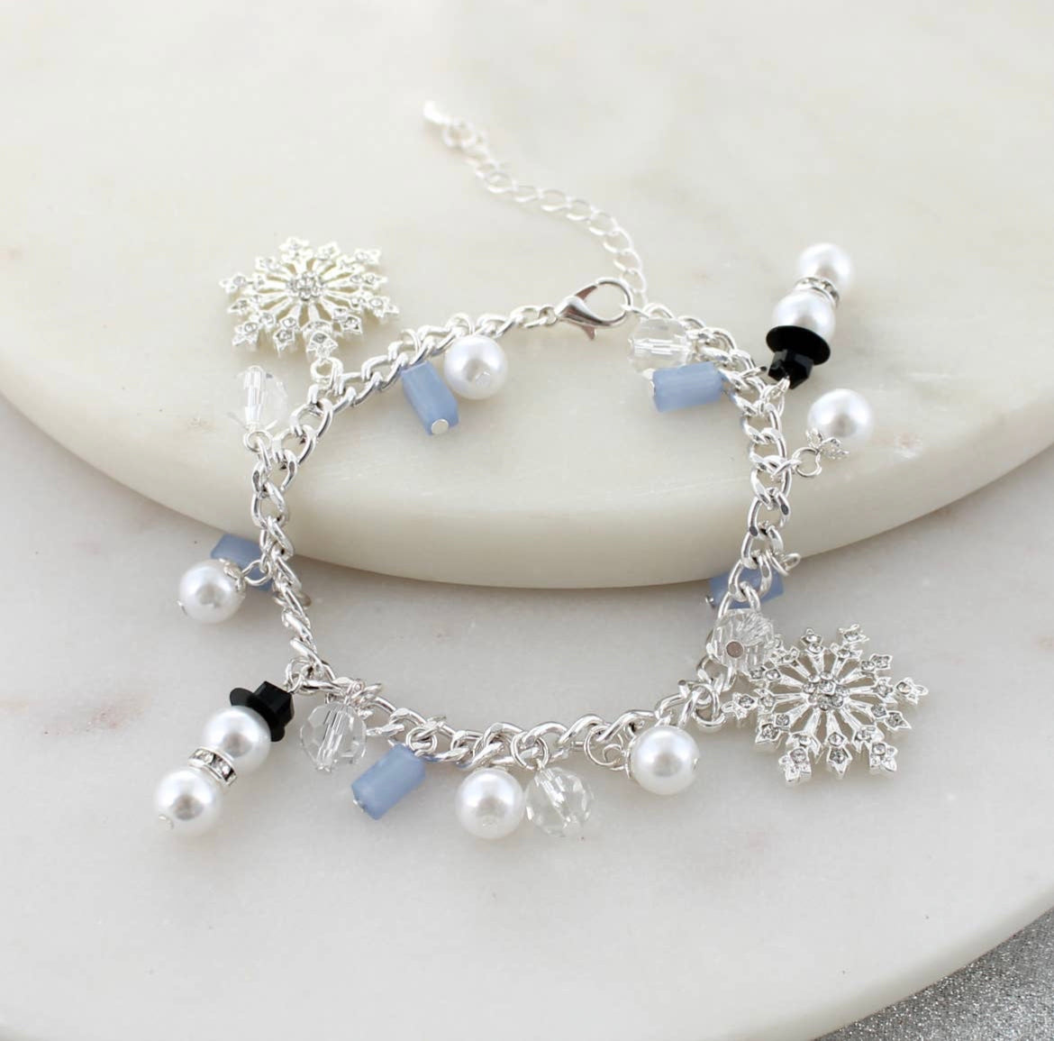 This adorable charm bracelet is the perfect complement to any of your wintry outfits. Complete with pearl snowmen, snowflakes, and pretty ice blue beads.