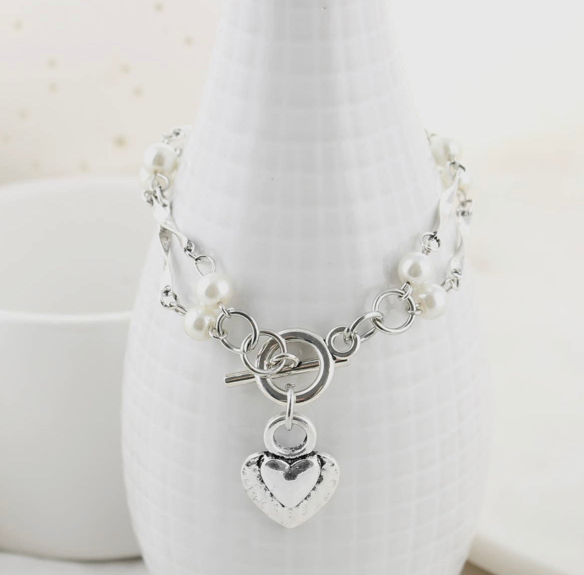 This pretty bracelet goes with everything! It’s dainty and can be dressed up or down. The heart charm and pearl details are so charming!
