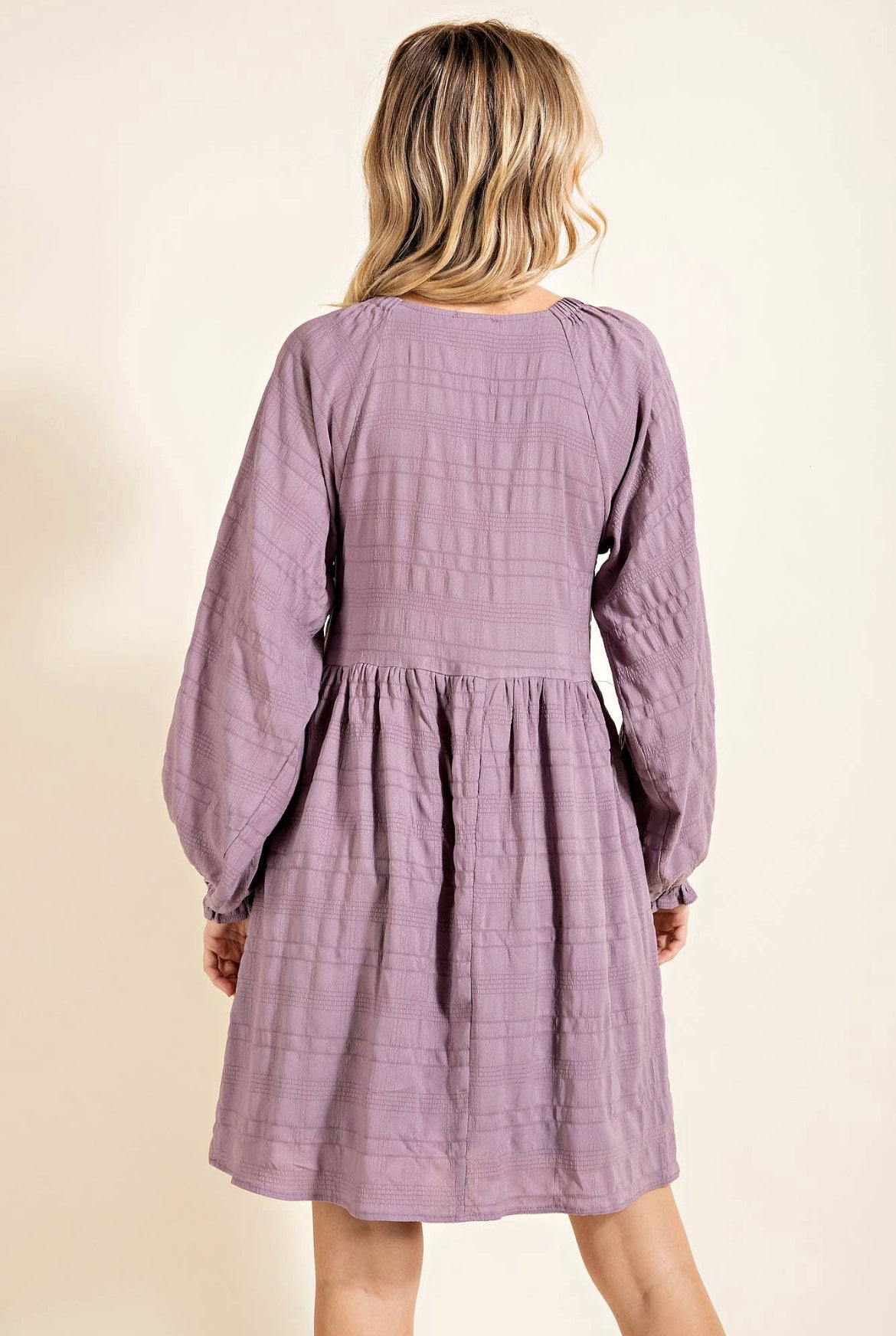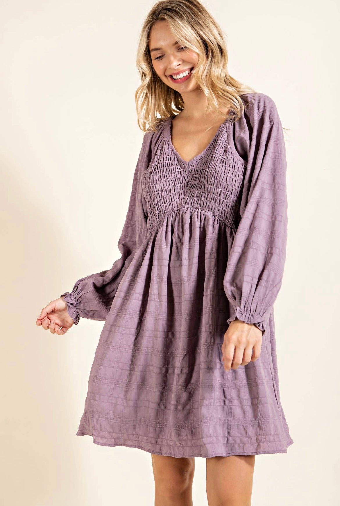 This pretty purple dress is ready for springtime! Add a pop of color and some texture to your look. Perfect for church, work, or lunch with the girls. Plus the smocked bust works great for girls of all sizes!